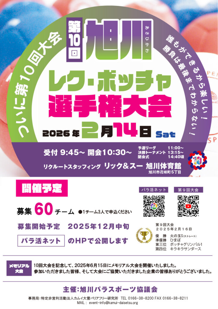 投稿日: 2025年11月5日2025年11月5日 投稿者: webadmin【開催告知】第10回旭川レク・ボッチャ選手権大会 開催予定:2026年2月14日(土) 開催場所:リクルートスタッフィング リック&スー旭川体育館 参加者募集予定 2025年12月頃
