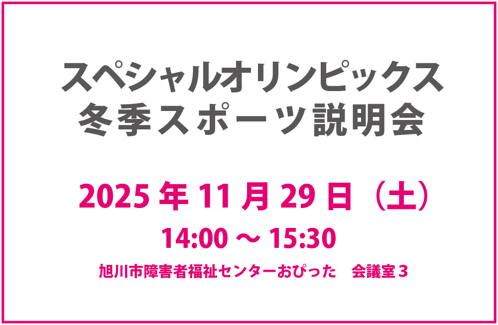 スペシャルオリンピックス冬季スポーツ説明会(旭川地区プログラム)を開催いたします。ご興味ございましたらぜひご参加ください